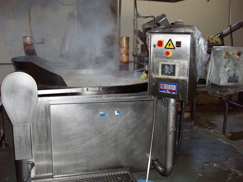 Freidora industrial para patatas fritas, modelo 1.87 de la marca Trabinox. Quemador de gasoil, cesta y batidor abatibles por pistones neuaticos.
